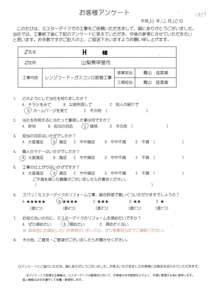 この度はご契約いただき、ありがとうございます。 弊社のホームページをご覧くださり、 また工事を依頼していただき、ありがとうございます。 総合評価では☆4・各項目では満足との 評価をいただきました。 まだ、H様に満足を提供できていなかったので しっかり満足していただけるよう、精進してまいります。 何かお困り事などございましたら、何なりとお申し付けください。 今後ともどうか、末永いお付き合いのほどよろしくお願いいたします。 担当 青山