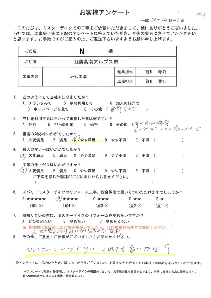 この度はご契約いただき、ありがとうございます。 ご近所ということで今回弊社をご利用していただき ありがとうございます。 工事の総合評価では☆4・マナーや仕上がりでは【大変満足】 という評価をいただきました。 担当の対応では、やや満足という事で私の至らない点が多く、 N様にご迷惑をおかけしてしまい申し訳ございません。 工事仕上がりだけでなく、全てにおいてご満足いただけるよう 努めてまいります。 また、カレンダーについては、アンケートとすれ違いで お渡しできていたかと思います。 ご利用していただけていたら、嬉しいです。 何かお悩みどころなどございましたら、何なりとお申し付けください。 今後ともどうか、末永いお付き合いのほどよろしくお願いいたします。 担当 龍川