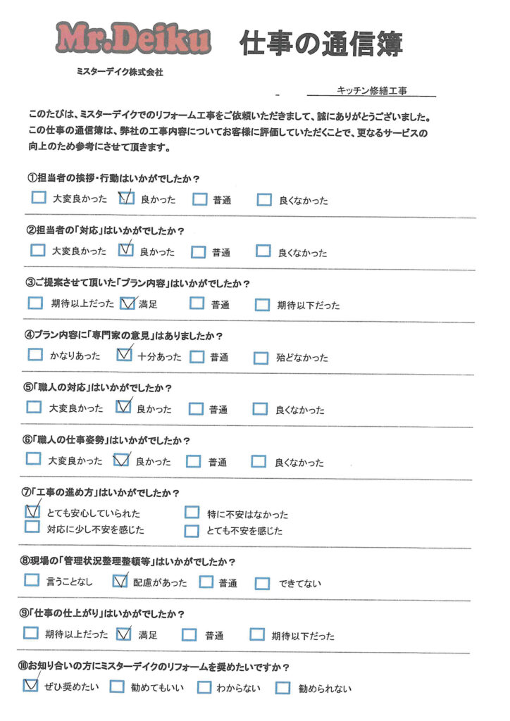 お客様とのコミュニケーションがうまくとれて、お客様の希望通りに仕上がって、 安心しております。 また何かございましたら、いつでもご連絡ください。