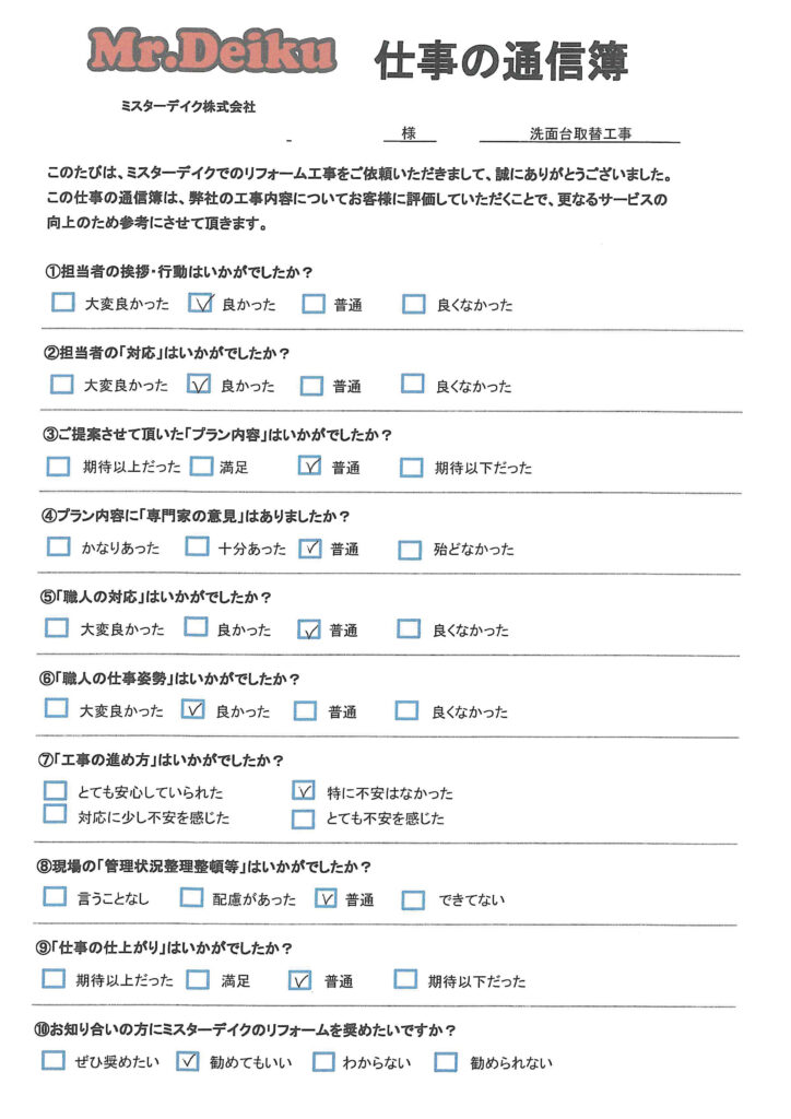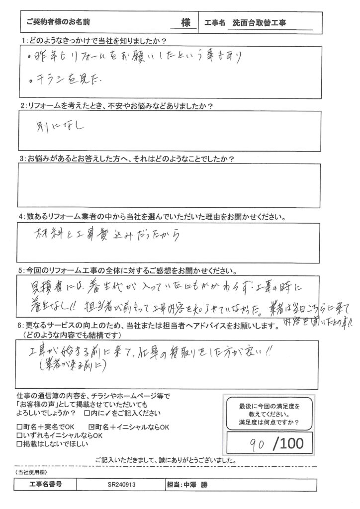 洗面台自体、新築当初からの製品 でしたので引出と扉が付いて デザインもお客様に 気にいって頂きました