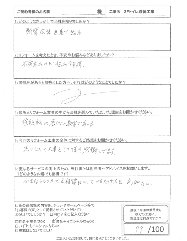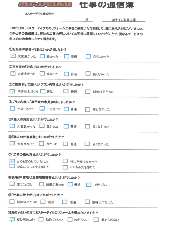 トイレの不具合がありリフォームを検討している中たまたまチラシが入っており御電話しました。 リフォームをすること自体に不安はありましたが値段的にもいいなと思い、ミスターデイクさんにお願いすることにしました。 コスパもよくお願いして良かったと思っております。 また何かあるときにはお世話になりますのでよろしくお願いいたします。
