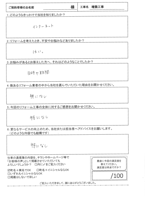 最初は不安が多かったリフォームですが担当営業さんの的確なアドバイスで相談もしやすく本当に良かったと思っています。 今後もまた相談やお願いがあると思いますがよろしくお願いいたします。