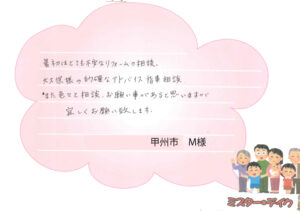 この度はミスターデイクをご利用いただきありがとうございます。 喜んでいただきありがとうございます。 今後ともアフターケアなどしっかりさせていただきますので、 何か困ったこと・不便に感じることがありましたら、今後いつでもご連絡ください!