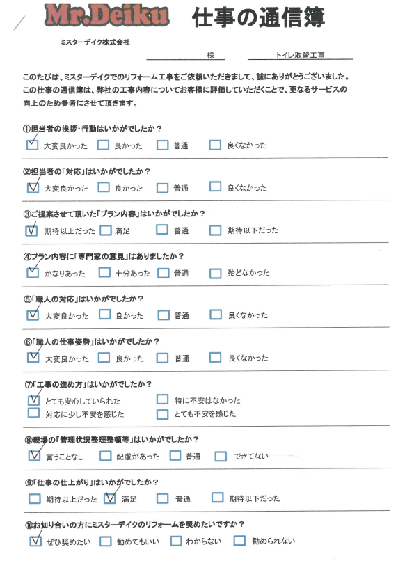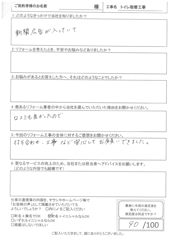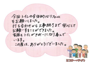 折り込みチラシが入っていたことをきっかけに気になっていたトイレ工事をお願いすることにしました。 事前に会社の評判も調べてみましたがクチコミもよかったことも決め手になりました。 実際に、打ち合わせから工事終了まで安心してお願いすることができ家族も新しいトイレになり喜んでいます。 ありがとうございました。
