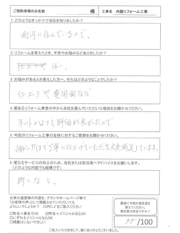 ご近所で目にしていたので気になってインターネットで調べてみたところ、クチコミもよかったのでお願いしました。 仕上がりや費用面に不安はありましたが細かいところまで丁寧に仕上げていただき大変満足しています。