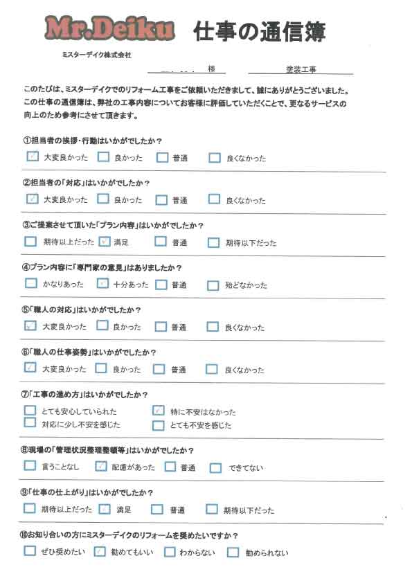 この度はミスターデイクをご利用いただきありがとうございました。 長いお付き合いでうれしく思っています。 うれしい言葉もいただきありがとうございます。 今後はアフターメンテナンス等でご対応させていただきます。ご不明な点等ありましたらお気軽にご相談くださいね!