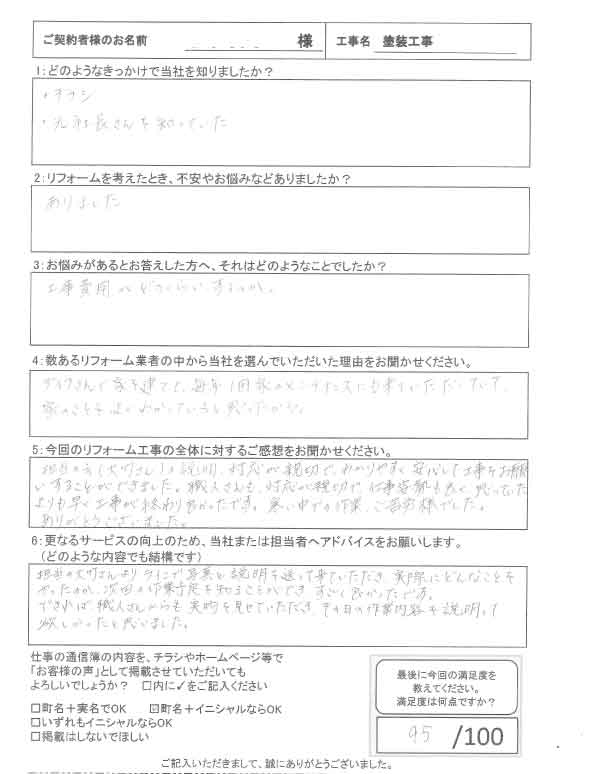 もともとデイクさんでお家を建てていて毎年のメンテナンスも来ていただいていたのでお家のこともよくわかっていらっしゃったのでお願いしました。 担当の方もLINEや写真などで丁寧な説明をしていただき実際にどんなことをやっていたのかなど不安はなくとっても親切で工事をお願いして良かったと思っていました。 職人さんも対応が親切で仕事姿勢も素晴らしく工期も思ったより短くて済みよかったと思っています。 ありがとございました。