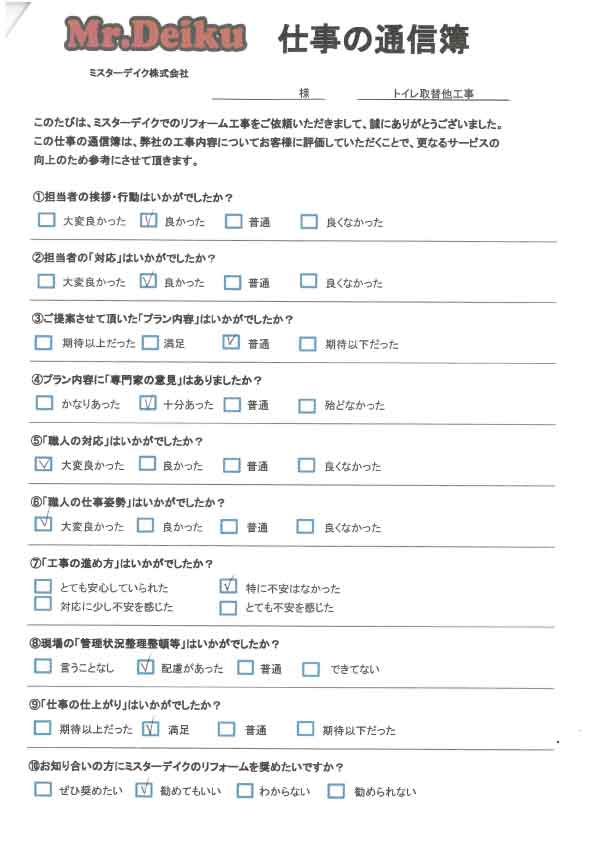 この度はミスターデイクをご利用いただきありがとうございました。 ご満足いただいたとのこと本当にうれしく思っております。 今後はアフターメンテナンス等でご対応させていただきます。ご不明な点等ありましたらお気軽にご相談くださいね!