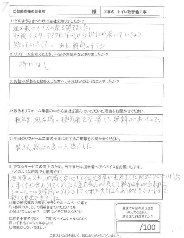 以前の会社からのお付き合いやチラシやDMなど頂いていたので覚えていました。 スタッフの皆さん感じがよかったのでお願いすることにしました。 担当者の方や職人さんのスキルが高いなと感じています。ショールームでも親切に対応していただき感謝しています。ありがとうございました。