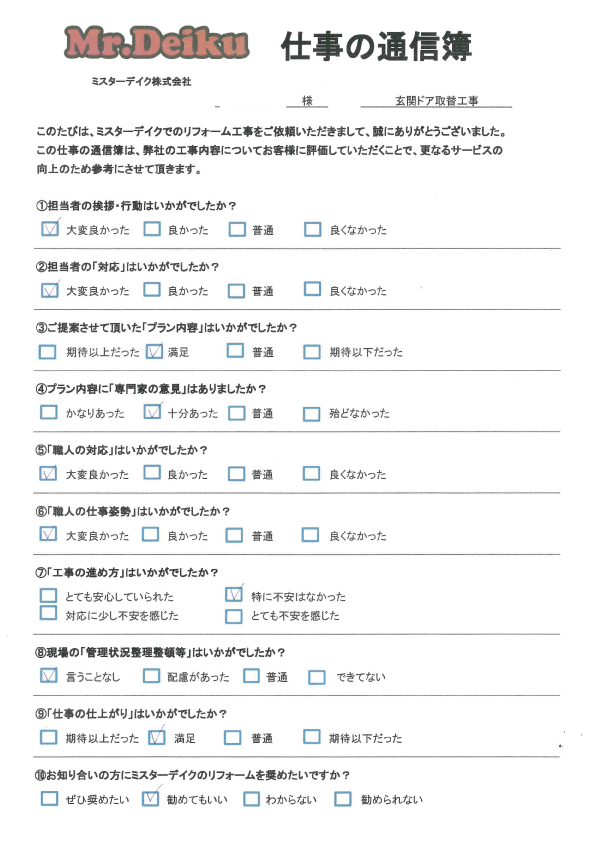 通りがかりの看板を見てご連絡をしました。 問い合わせに対するレスポンスの速さと、知識の豊富さでミスターデイクさんに工事をお願いすることに決めました。 相談やスケジュール・施工までとてもスムーズだったので本当に良かったと思っています。ありがとうございました。