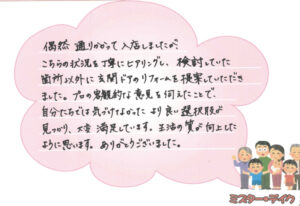 今回はお世話になりました。 喜んでいただき本当にうれしく思っています。 今後、メンテナンスなどでお邪魔させていただきますので不具合などあればお気軽にお声がけくださいね!