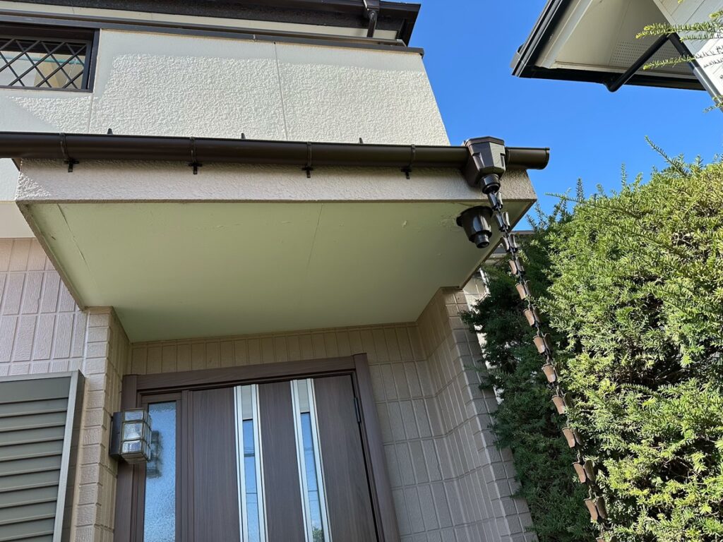 玄関、屋根雨樋に枯れ葉が詰り溢れた雨水が軒天に
